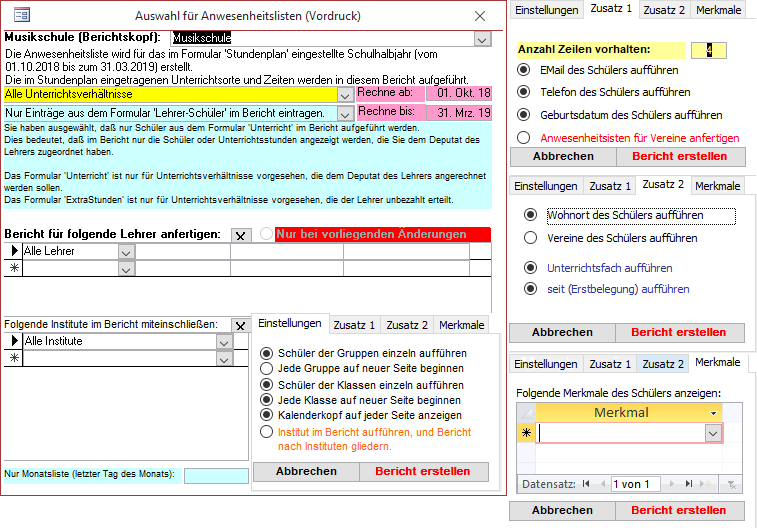 Dieser Bericht fertigt einen Vordruck von Anwesenheitslisten für beliebige Lehrer für das aktuelle Schulhalbjahr an. In dem Bericht werden alle Schüler bzw. Gruppen aufgeführt, die im aktuellen Schulhalbjahr Unterricht erhalten. Falls Sie im Stundenplan den Unterrichtstag, Unterrichtsort oder die Unterrichtszeit eingetragen haben, werden diese in dem Vordruck ebenfalls aufgeführt.