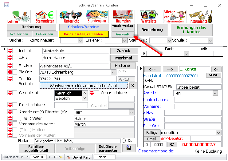 1. Stammdaten/Schüler oder Stammdaten/Lehrer oder Stammdaten/Institut/Zweigstelle oder Stammdaten/Kindergarten/Schule/Verein oder Daten eines Kontoinhabers