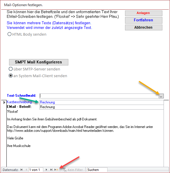 Geben Sie dem Text eine Kurzbezeichnung (grünerPfeil), damit Sie ihren gewünschten Text später schnell über die Auswahlliste (gelber Pfeil) auswählen können.