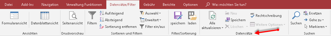 Im Bereich Datensätze können Sie die Anzeige aktualisieren, um beispielsweise sicher zu stellen, dass Sie im Netzwerkbetrieb neu eingetragene Datensätze anderer Anwender sehen (Alle aktualisieren) oder Änderungen an bestehenden Datensätzen aktualisiert sehen (Aktualisieren). Der Befehl 'Aktualisieren' wird alle 15 sec. immer automatisch ausgeführt.
