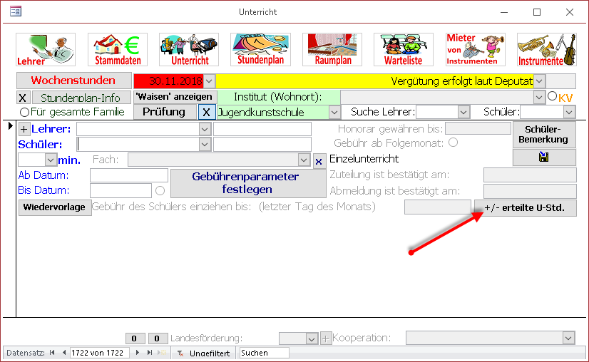 Wählen Sie im Formular –Unterricht– das Schaltfeld +/- erteilte Unterrichtsstunden um die Plus/Minus Stunden für das aktuell angezeigte Unterrichtsverhältnis festzuhalten.