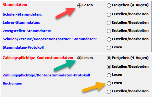 Die Minimalberechtigung Lesen für Zahlungspflichtige-Kontenstammdaten (grüner Pfeil) kann nur dann eingestellt werden, wenn auch Stammdaten Lesen (roter Pfeil) eingestellt ist. Dies muss sein, damit die Zahlungspflichtigen den zugewiesenen Stammdaten der Schüler zugeordnet werden können.