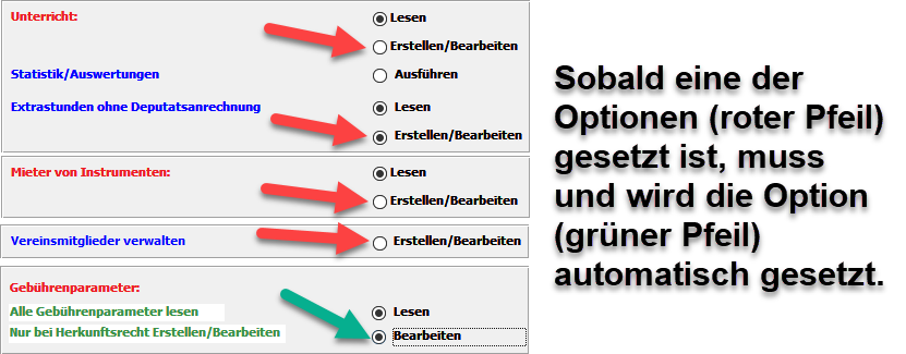 Das Recht Erstellen/Bearbeiten in den Bereichen Unterricht, Mieter von Instrumenten oder Vereinsmitglieder verwalten, benötigt jeweils auch das Recht Gebührenparameter nur bei Herkunftsrecht Bearbeiten. Dieses Recht wird dann von POWMUSIK unter entsprechendem Hinweis automatisch gesetzt, und begründet sich damit, dass bei den genannten Bereichen die Gebührenparameter dazu