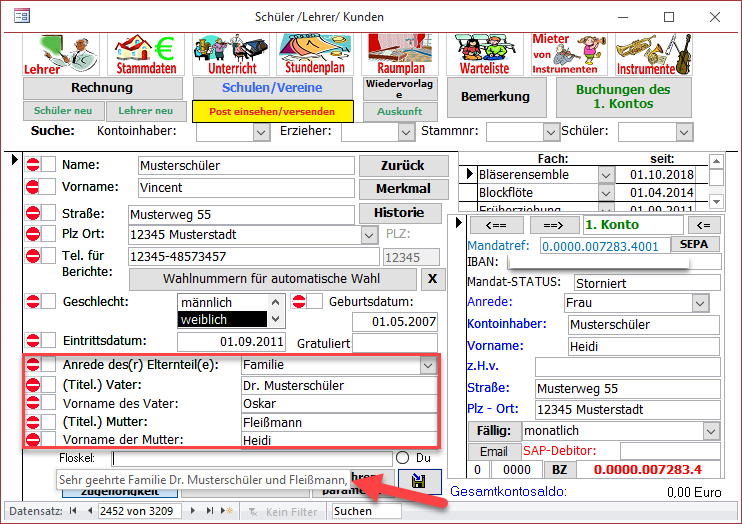 Wird das Feld Floskel nicht ausgefüllt, wird die Floskel auf Basis der in den Stammdaten hinterlegten Angaben (roter Rahmen) automatisch erstellt.
