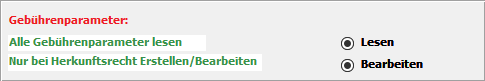 kann über die Option 'Gebührenparameter jeglicher Herkunft' dem Benutzer das Recht eingeräumt werden alle Gebührenparameter zu bearbeiten gleichwohl er das Recht Erstellen/Bearbeiten für das Herkunftsformular besitzt oder nicht besitzt.
