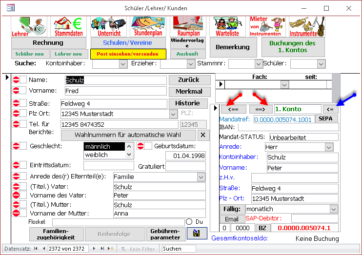 Hingegen können dieselben Bankverbindungen mit dem dazugehörigen Kontoinhaber mehrfach bei verschiedenen Schülern angeschlossen sein. Ein Zustellbevollmächtigter kann ja beispielsweise SchülerX und SchülerY vertreten. In diesem Fall ist das Konto des Zustellbevollmächtigten bei SchülerX und bei SchülerY eingerichtet, hat aber dann bei beiden Schülern identische Daten (Stammnummer, Name und Anschrift, Bankverbindung).