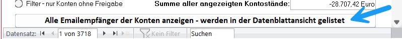 Wählen Sie anschließend im Formularfuß der Liste 'Alle Emailempfänger der Konten anzeigen - werden in der Datenblattansicht gelistet' (blauer Pfeil).