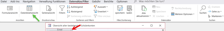 wechseln Sie anschließend über die Menüleiste 'Datensätze/Filter' zur Datenblattansicht (grüner Pfeil) und öffnen Sie das Filtermenü im Feld 'EMail' (roter Pfeil).