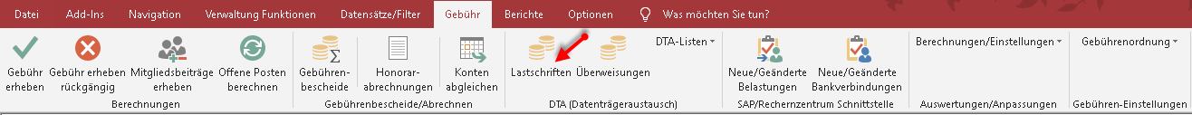 Dieser Menüpunkt öffnet ein Auswahlformular, mit dem Sie folgende Buchungen für das Schreiben der Lastschriften XML-Datei auswählen können.