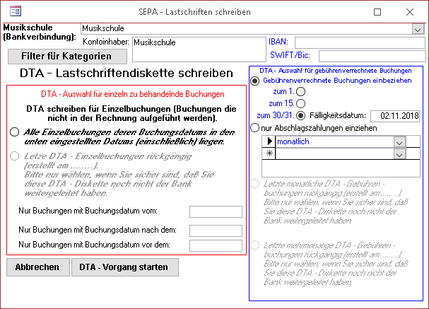 b.) Alle Buchungen mit negativem Einzelsaldo und Einzugsermächtigung. Bei dieser Option können Sie die Buchungen nach dem Buchungsdatum einschränken (Buchungen am -, oder Buchungen vor -, oder Buchungen nach dem Datum)