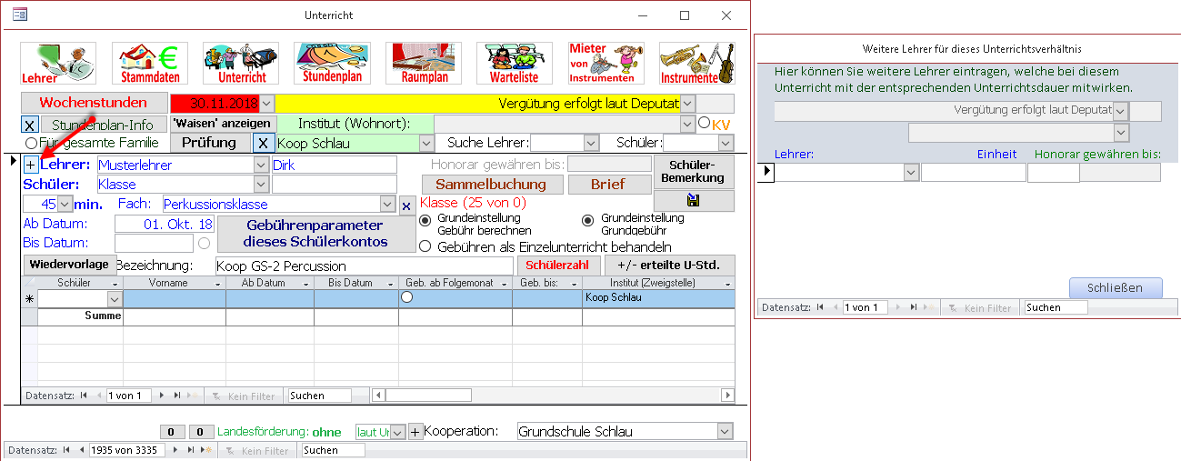 Zusätzliche Lehrer eines Unterrichtsverhältnisses können eine vom Stammunterrichtsverhältnis abweichende Unterrichtseinheit erhalten, welche dann auch so im Deputat dieses Lehrers oder bei der Honorarabrechnung dieses Lehrers berücksichtigt wird. s. roter Pfeil