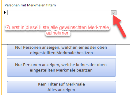 Damit können Sie die Personenliste einfach mit dem Inklusionsverfahren (nur Personen anzeigen, welche eines der festgelegten Merkale besitzen) oder Ausschlussverfahren (nur Personen anzeigen, welche keines der festgelegten Merkale besitzen) filtern.