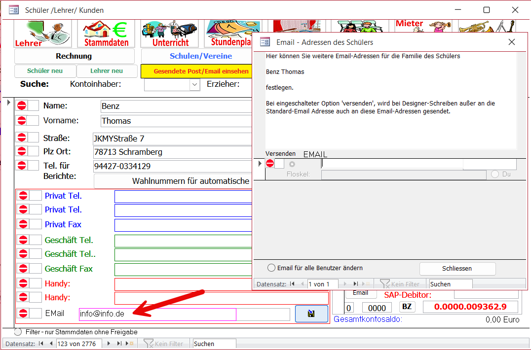 In POW ist es möglich bei einem Schüler oder Kontoinhaber mehrere Emailadressen zu hinterlegen. Die weiter hinterlegten Emailadressen lassen sich dann nicht ohne weiteres finden, insbesondere zusätzlich hinterlegte Mailadressen.