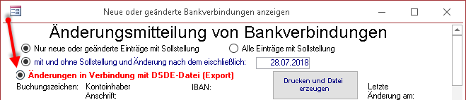 Um Neuanlagen/Änderungen von Bankverbindungen über die SAP-Schnittstelle zu übertragen muss die Option 'Änderungen in Verbindung mit DSDE-Datei (Export)' (roter Pfeil) aktiviert sein.