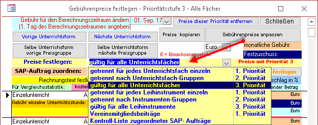 Im einfachsten Fall füllen Sie nur die 3. Priorität aus. Damit wird für alle Fächer einer Unterrichtsform derselbe Preis angewendet, und Sie brauchen den Preis für jede Unterrichtsform nur einmal eintragen. In Priorität 3 werden alle Datensätze vorbelegt, und Sie müssen nur noch die Preise für jede Unterrichsform - Preisgruppe eintragen.