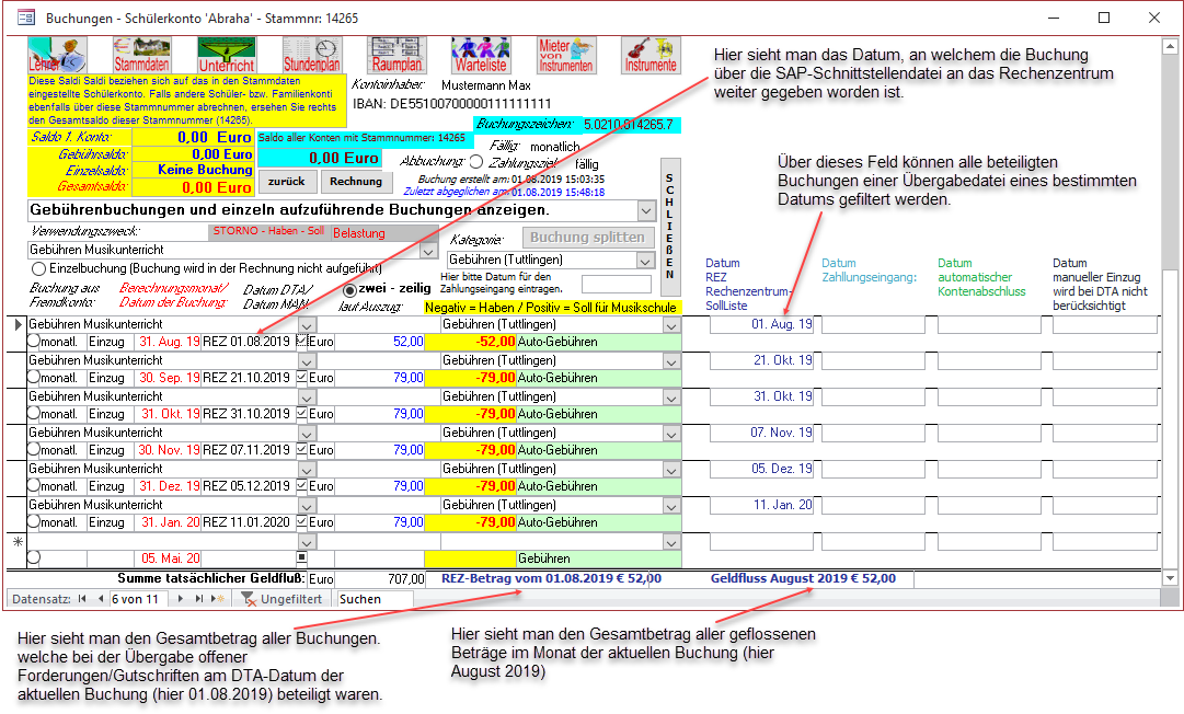 Beim Ausführen (Drucken) der Soll-Liste und damit verbundenem Erzeugen einer (SAP)-Schnittstellendatei zur Weitergabe an das Rechenzentrum werden die betroffenen Buchungen automatisch abgeglichen, und es wird das REZ-Datum (Rechenzentrum) der Buchung festgehalten.