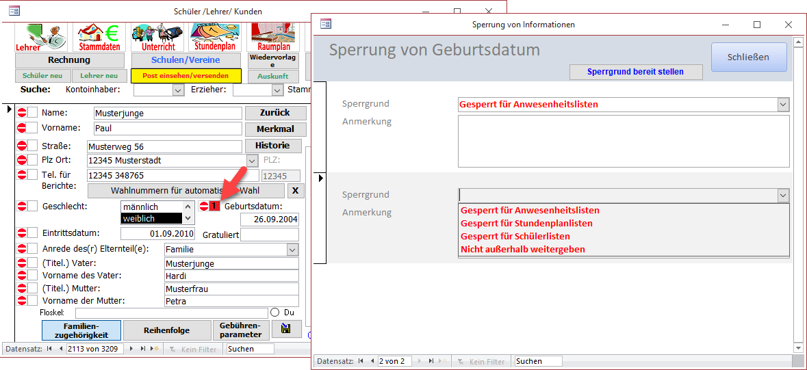 Beispielsweise kann das Geburtsdatum explizit für die Veröffentlichung in Schülerlisten oder der Anwesenheitsliste gesperrt werden.