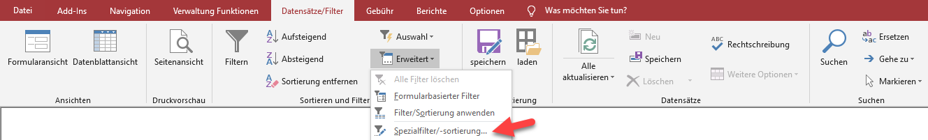 Zeigen Sie im Menü Datensätze auf Filter, und klicken Sie dann auf Spezialfilter/-sortierung