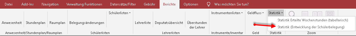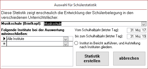 Sie können mit diesem Menüpunkt ein Diagramm erzeugen, das die Entwicklung der Anzahl von unterrichteten Fächern über mehrere Schulhalbjahre veranschaulicht. Gleichzeitig erhalten Sie einen Bericht, der Ihnen genau die Anzahl der unterrichteten Fächer aufgeschlüsselt nach Unterrichtseinheit (30 oder 45 min.) bzw. Einzel oder Gruppenunterricht anzeigt.
