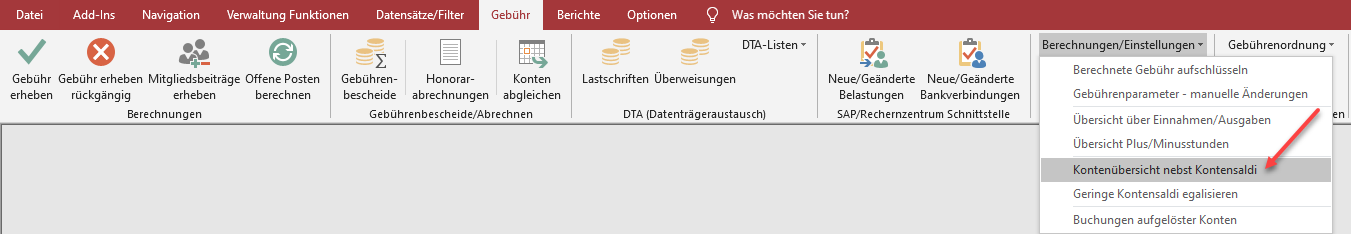 Wählen Sie den Befehl 'Kontenübersicht nebst Kontensaldi' (roter Pfeil)