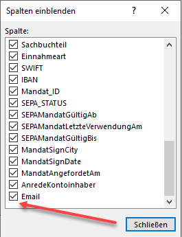 Wählen Sie 'Felder wieder einblenden' und stellen Sie sicher, dass das Feld Email angezeigt wird.