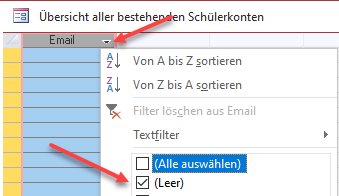 Stellen Sie über den Filter beim Feld Email ein, dass nur leere Felder angezeigt werden