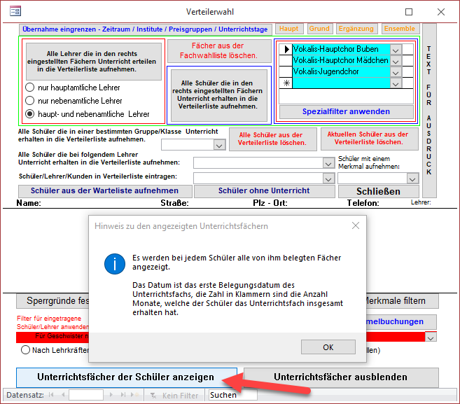 Über dieses Schaltfeld können Sie die belegten Unterrichtsfächer der Schüler einblenden.