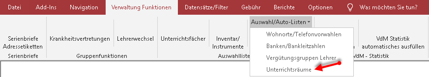 Klicken Sie in der Symbolleiste auf das Symbol –Zu neuem Datensatz–. Tragen Sie den gewünschten Unterrichtsraum ein. Beachten Sie, dass der Unterrichtsort in nur einem Feld angegeben wird, und zwar in der Reihenfolge Gebäude - Zimmer. (z.B. Holstein-Gymnasium Zi.4 oder Grundschule Schiltach Musiksaal)