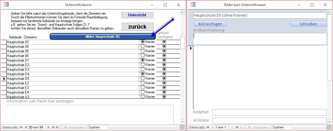 Sie haben die Möglichkeit Bilder der Unterrichtsräume einzufügen (blauer Pfeil), welche Sie dann jederzeit einsehen können.