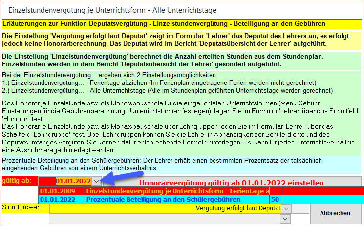 Übrigens: Über die Auswahlliste (grüner Pfeil) können Sie für den aktuellen Lehrer den Standardwert für die Vergütung einstellen, welcher dann beim Erfassen neuer Unterrichte automatisch eingestellt wird.