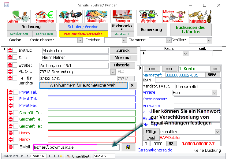 Zum Austausch der Stundenplandaten mit dem Lehrer, können die Stundenpläne des Lehrers nach Excel exportiert und dann im Serienbrief per Email versendet werden. Vom Lehrer mit Tag, Uhrzeit und Unterrichtsort ausgefüllte Excel-Stundenpläne können dann in POWMUSIK wieder importiert werden. Diese Excel Stundenplantabellen werden jetzt auch verschlüsselt, sofern beim Lehrer ein Kennwort für den Email-Versand hinterlegt ist.