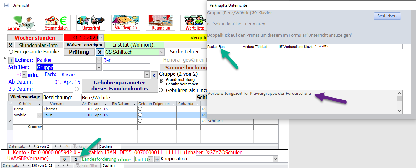 Sie sehen nun den verknüpften Unterricht (grüne Pfeile) und können über Doppelklick direkt zu der Vorbereitungszeit navigieren.