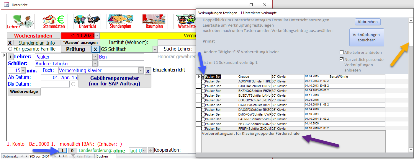 Beachten Sie, dass Sie mit dem Scrollbalken (gelber Pfeil) durch die Liste scrollen können, und in Abhängigkeit der Optionen 'Nur zeitlich passende Verknüpfungen anbieten' und 'Alle Lehrer anbieten' die Auswahlliste zum zuweisen von Verknüpfungen entsprechend angeboten wird.