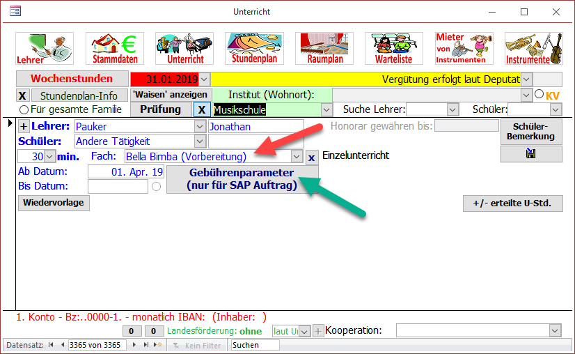 Man muss zuvor in der Unterrichtsfachauswahlliste ein Fach anzulegen, welches die zusätzliche Tätigkeit des Lehrers beschreibt (roter Pfeil).