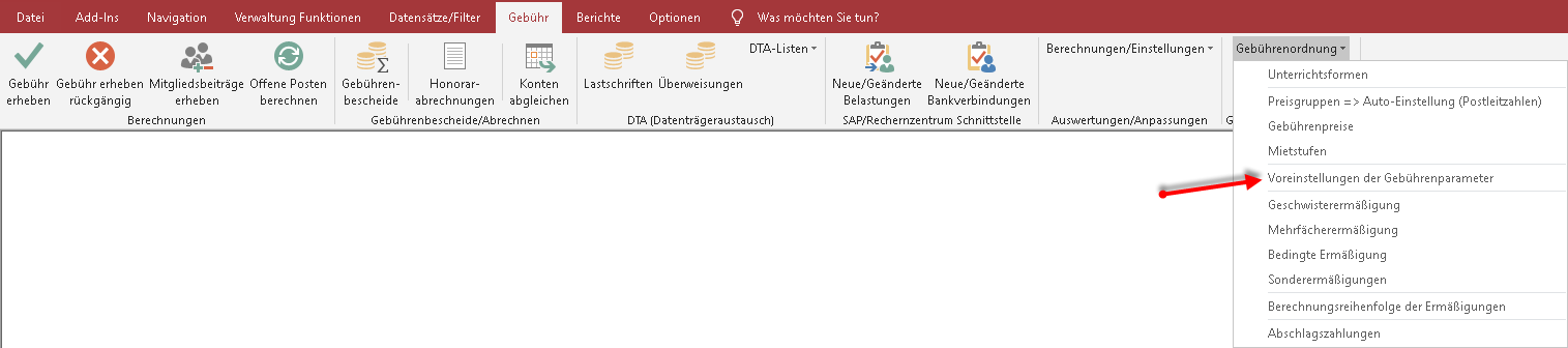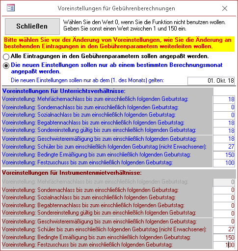 Wählen Sie aus dem Menüband ‘Gebühr’ – ‚Gebührenordnung’ den Menüpunkt ‘Voreinstellungen der Gebührenparameter festlegen’. Stellen Sie für jede Ermäßigungsart ein, bis zu welchem Geburtstag Sie angewendet werden soll. Diese Eintragungen werden beim Eintragen von Unterrichtsverhältnissen automatisch vorgetragen. Sie können jedoch bei jedem Unterrichtsverhältnis in den Gebührenparametern individuell einstellen, bis zu welchen Geburtstag die jeweilige Ermäßigung angewendet werden soll.