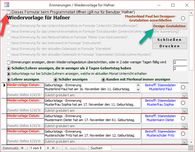 Über die Option (roter Pfeil) können Sie festlegen, dass die Wiedervorlage beim Programmstart angezeigt wird.