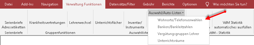 Mit dieser Funktion können Sie die Wohnortliste bearbeiten. POWMUSIK merkt sich beim Erfassen der Stammdaten automatisch alle eingetragenen Wohnorte nebst Postleitzahl und Telefon-Vorwahl. Beim Erfassen weiterer Schüler oder Lehrer mit demselben Wohnort werden deshalb diese Daten gleich automatisch entsprechend ergänzt. Falls Sie beim Erfassen Fehler gemacht haben,.können Sie hier die Einträge der Wohnortliste korrigieren oder auch löschen.