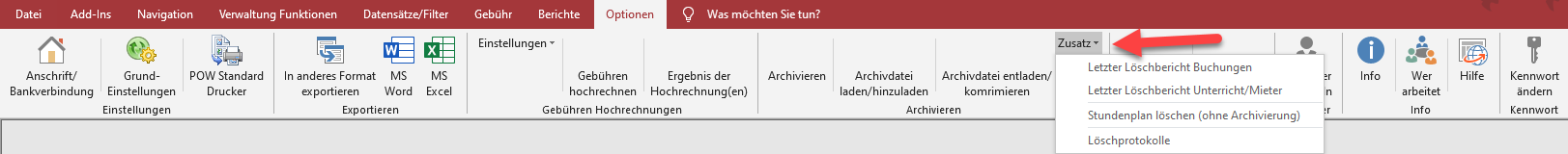 Über das Zusatzmenü können SIe die letzten Löschberichte einsehen, Stundenpläne ohne Archivierung löschen und Löschprotokolle einsehen.