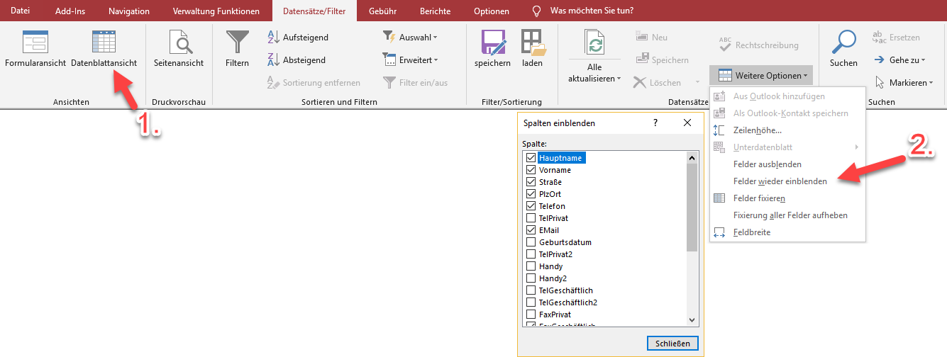 Beachten Sie: In der Datenblattansicht können Sie möglicherweise weitere Felder einblenden - oder auch angezeigte Felder ausblenden