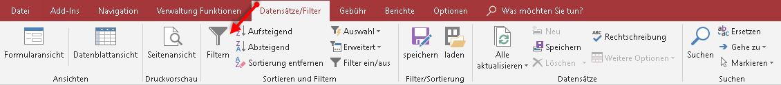 Danach wählen Sie im Menüband Datensätze/Filter das Schaltfeld 'Filtern'.