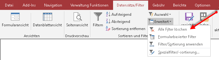 Um Filter in einem Formular zu entfernen wählen Sie den Befehl 'Alle Filter löschen'