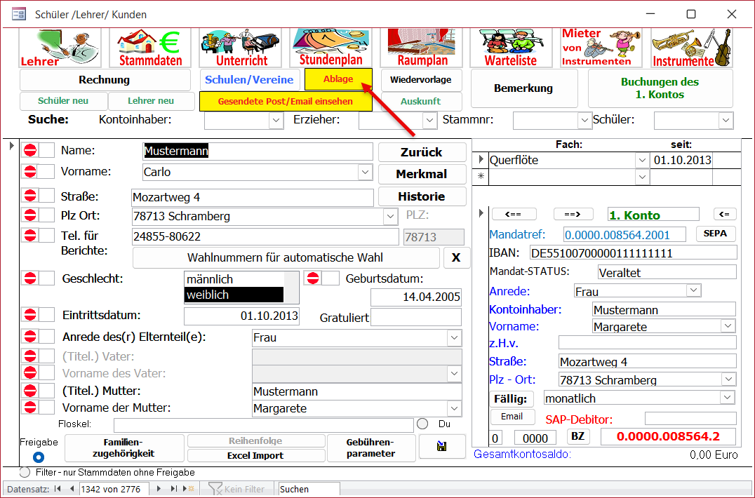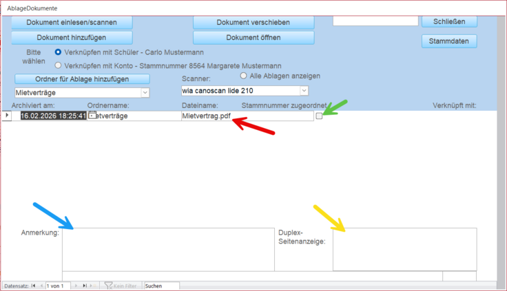 Beim Wechsel zur Ablage wird immer der aktuelle Datensatz in den Stammdaten und das aktuelle Konto in den Stammdaten zum Ablegen von Dokumenten angeboten.
