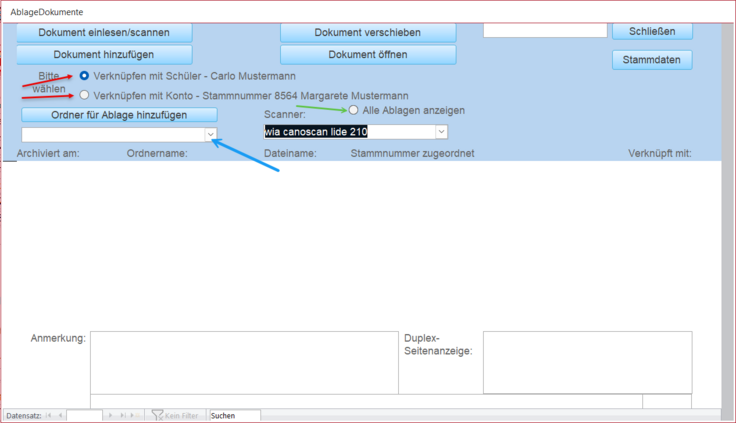 Vor dem Aufnehmen von Dokumenten müssen Sie einen oder mehrerer Ordner für die Ablage erstellen. Dies machen Sie über das Schaltfeld 'Ordner für Ablage hinzufügen' oder Doppelkick auf die Auswahlliste Ordner blauer Pfeil).
