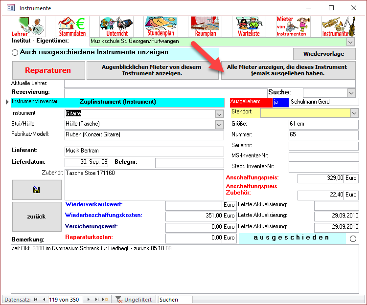 Zeigen Sie im Formular 'Instrumente' das Instrument an, für welches Sie alle Mieter anzeigen wollen, die jemals dieses Instrument ausgeliehen haben. Doppelklicken Sie jetzt auf das Feld –ausgeliehen–. Das Formular –Mieter– öffnet sich, und zeigt alle Mieter an, die dieses Instrument jemals ausgeliehen haben.