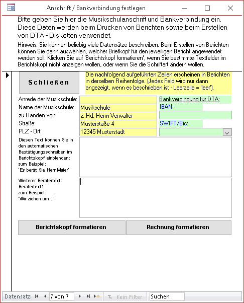 Berichtskopf formatieren und Rechnung formatieren liefern bei Aufruf noch eine gesonderte Hilfe dazu.