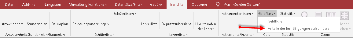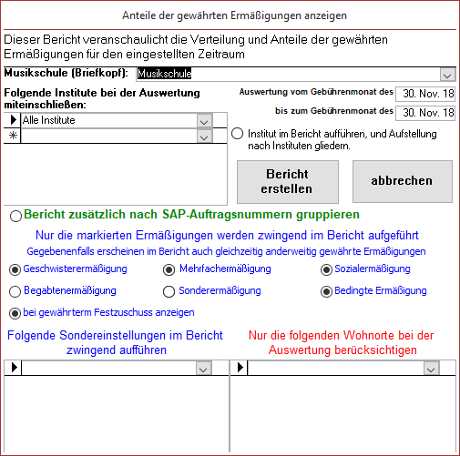 Über diesen Bericht können Sie die Schüler mit gewährten Ermäßigungen über beliebie Zeiträume auflisten. Am Ende des Berichts werden die Summen gewährter Ermäßigungen angezeigt.