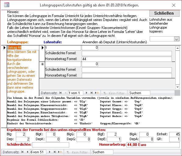 Lohngruppen eignen sich um die Vergütung in Abhängigkeit der Schülerdichte einzurichten. Dabei kann über Lohnstufen festgelegt werden ab welchem Deputatsumfang die für die Vergütung festgelegten Formeln angewendet werden.