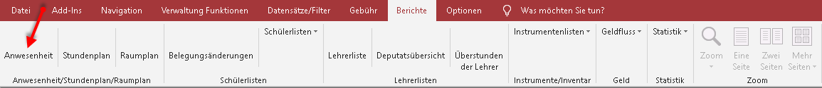 Dieser Bericht fertigt einen Vordruck von Anwesenheitslisten für beliebige Lehrer für das aktuelle Schulhalbjahr an. In dem Bericht werden alle Schüler bzw. Gruppen aufgeführt, die im aktuellen Schulhalbjahr Unterricht erhalten. Falls Sie im Stundenplan den Unterrichtstag, Unterrichtsort oder die Unterrichtszeit eingetragen haben, werden diese in dem Vordruck ebenfalls aufgeführt.