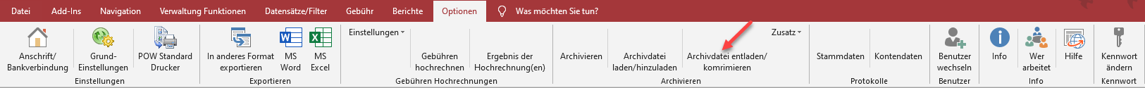 Über Archivdatei entladen können Sie die Archivdaten wieder entladen. Sobald Sie die Archivdatei entladen haben, können Sie wieder Änderungen an den Daten vornehmen.