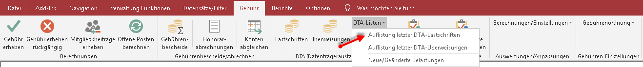 Mit diesem Menübefehl können Sie alle Lastschriften der zuletzt angefertigten DTA-Lastschriftendiskette ausdrucken.